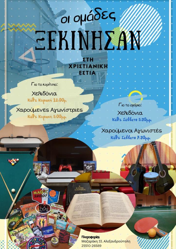 Χριστιανική Εστία Αλεξανδρούπολης ΑρχικήΠληροφορίεςΔημοσιεύσειςΦωτογραφίεςΕπικοινωνίαΧριστιανική Εστία Αλεξανδρούπολης Οι ομάδες ΞΕΚΙΝΗΣΑΝ! Πανελλήνιο συνέδριο Χαρούμενων Αγωνιστών Αθήνα 2022 Κάλαντα Χριστουγέννων 2022 Σάββατο του Λαζάρου στην Χριστιανική Εστία! Μία Συνάντηση για Οικογένειες! Τηλέφωνο Επικοινωνίας: 25510 26589 Διεύθυνση: Μαζαράκη 33, 681 00 Αλεξανδρούπολη Κωνσταντίνου Μαζαράκη